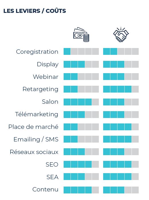 La présente étude indique que les leviers les plus transformateurs sont encore aujourd’hui le retargeting, les places de marchés, l’emailing, le SEO et le SEA. Etrangement le SEO parait plus onéreux que le SEA, tout comme les salons et le marketing de contenus.